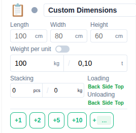 Need specific cargo dimensions? Define custom cargo units with your own dimensions, weight, stacking rules, and loading methods. Perfect for non-standard cargo or specialized operations.