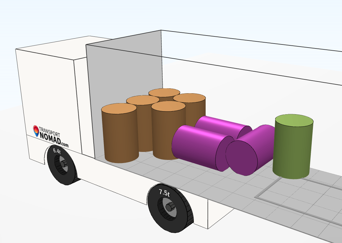 Handle cylindrical cargo in both orientations with proper weight distribution and stacking calculations.
