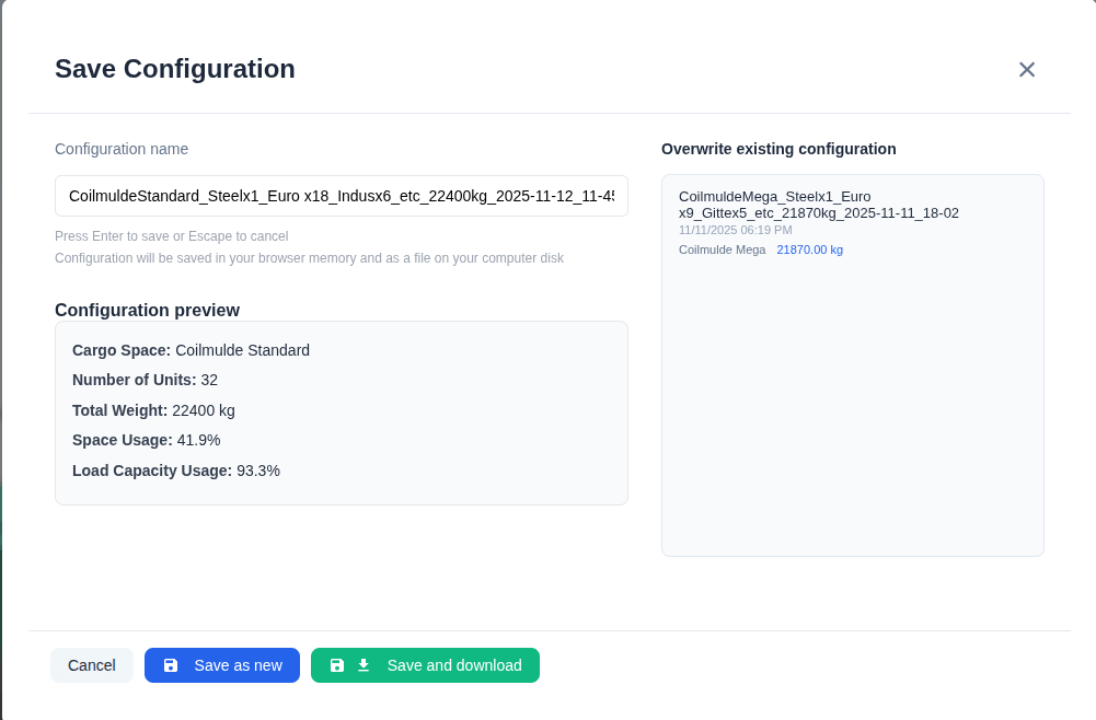 Save your cargo plans to browser memory or download as files. Quick-save feature with automatic naming.