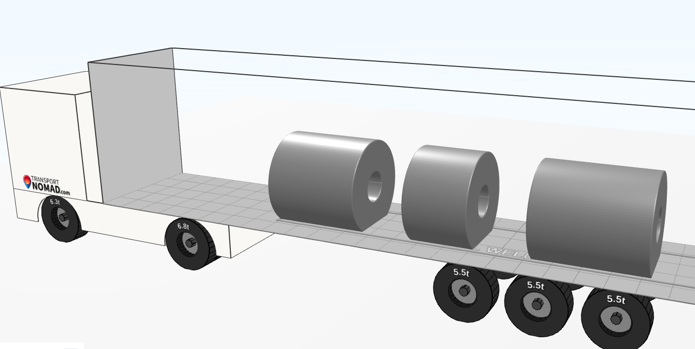 Transporting steel coils? Use Coilmulde trailers with specialized groove visualization. Steel coils are restricted to X-axis movement along the groove for realistic and safe load planning.